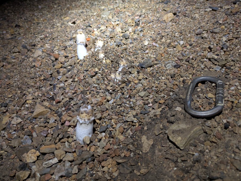 Ci troviamo nella Grotta Nuovi Orizzonti (situata nel Parco Regionale Campo dei Fiori a Varese) a circa 100 metri di profondità, all’interno di quella che è chiamata Sala della Polvere Lunare. Questa Sala è caratterizzata dal fatto che in occasione di abbondanti piogge si riempie completamente d’acqua. Infatti sul soffitto si possono notare pezzi di legno, foglie, ricci di castagne e purtroppo anche parecchi residui di plastica. In pratica la grotta filtra naturalmente l’acqua che la attraversa, la stessa acqua che defluendo più a valle finisce nelle risorgenze da cui la attingiamo per alimentare la rete idrica. Nel terreno di questa sala si trovano quindi parecchie sostanze organiche che permettono la crescita di questa specie di funghi.